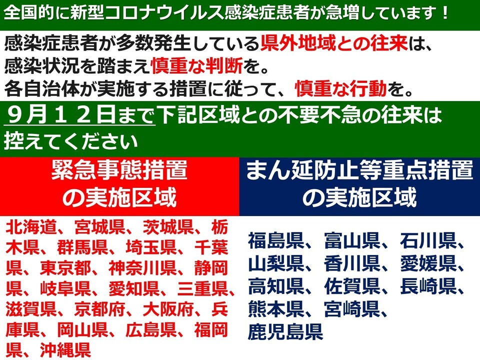 まん延防止等重点措置適用8月20日9月12日 広島県では7月31日9月12日を期間として新型コロナ感染拡大防止 早期集中対策を実施しておりましたが感染状況を踏まえてまん延防止等重点措置が8月20日9月12日の期間で適用されました.
